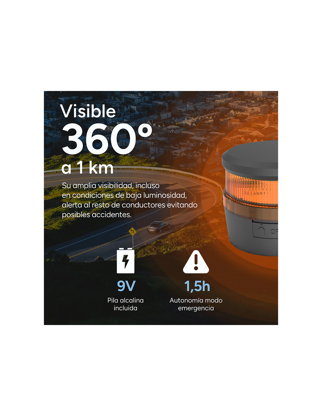 Su luz ámbar alcanza hasta 1 km y se proyecta en 360°, aumentando tu seguridad y la de otros conductores. Gracias a su base magnética, podrás colocarla en el techo del coche o en las biondas de la carretera de forma rápida y estable.