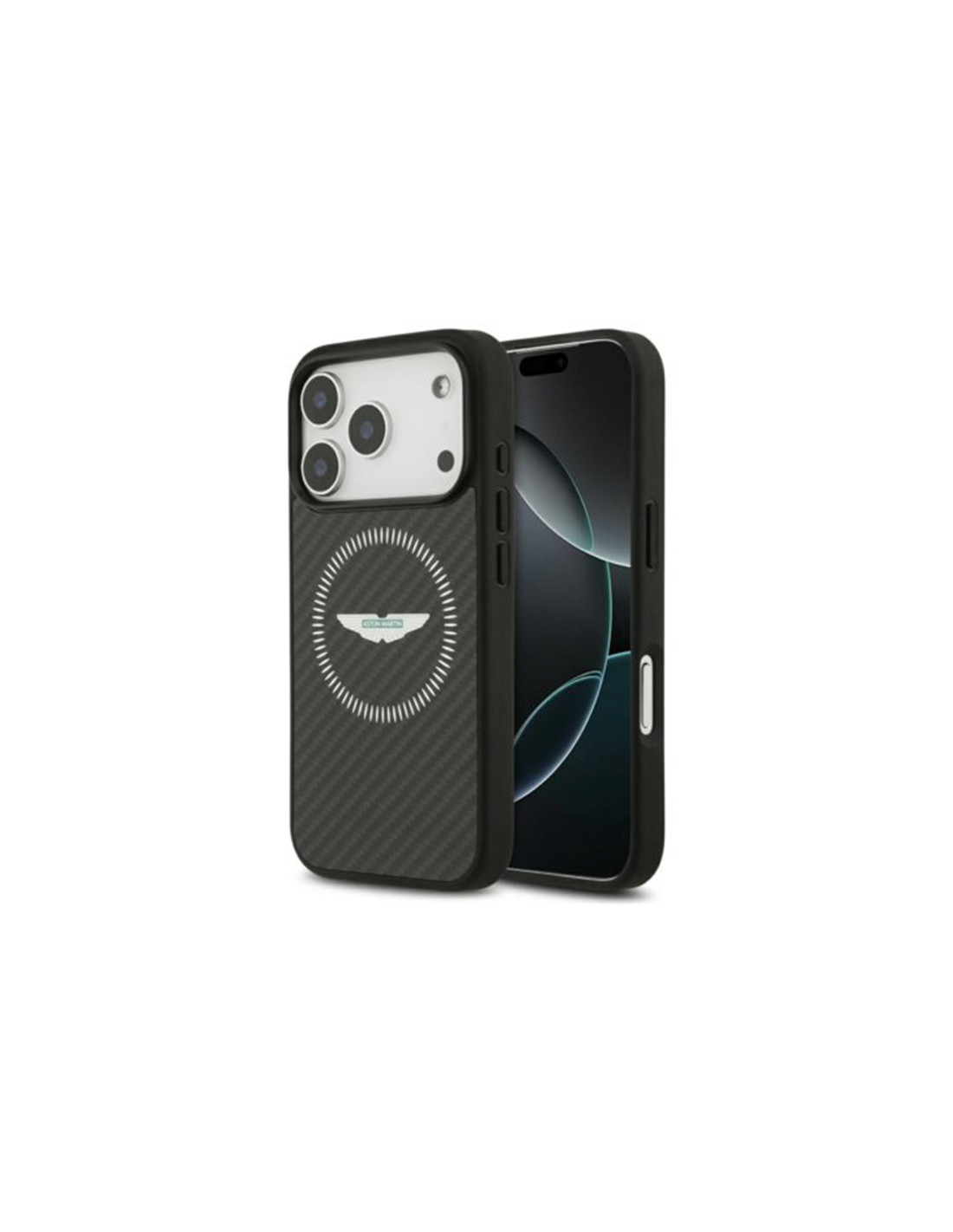 Funda Aston Martin iPhone 17 Pro Kevlar Counter Design MagSafe negra con diseño exclusivo y acabado premium. Protección reforzada con estructura resistente y compatibilidad total con carga magnética MagSafe.