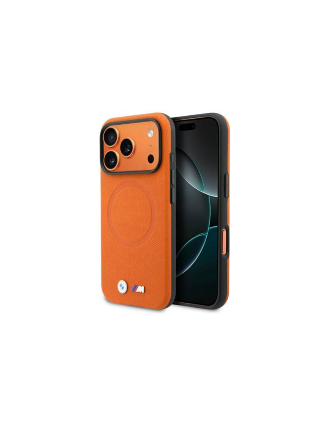 Funda BMW M iPhone 17 Pro FW Logo Metal MagSafe naranja con diseño deportivo premium. Logo metálico oficial BMW M, protección reforzada y compatibilidad total con carga magnética MagSafe.