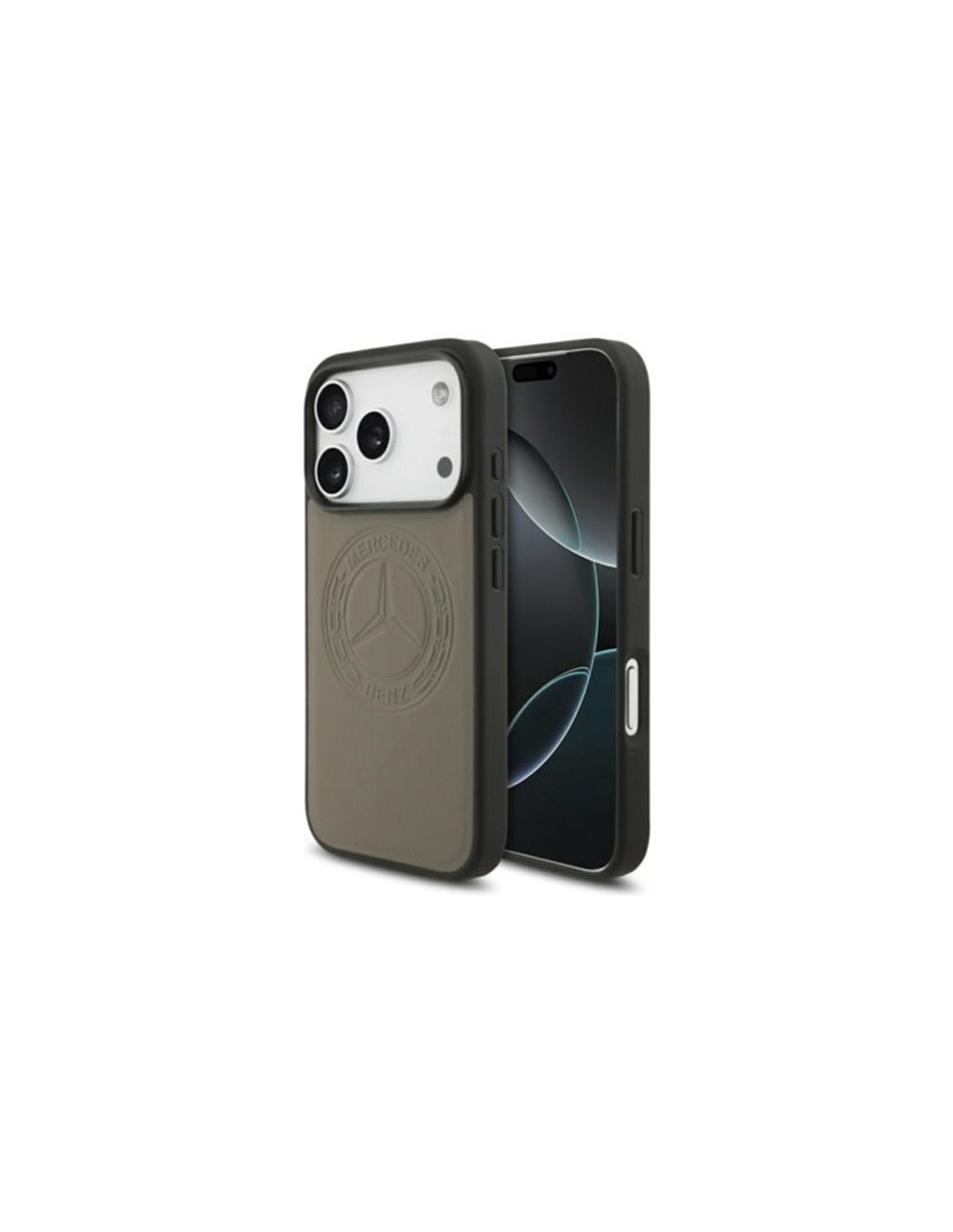 Funda Mercedes iPhone 17 Pro Max Vintage Logo MagSafe taupe en piel sintética premium. Diseño exclusivo con logo clásico Mercedes-Benz, protección reforzada y compatibilidad total con carga MagSafe.