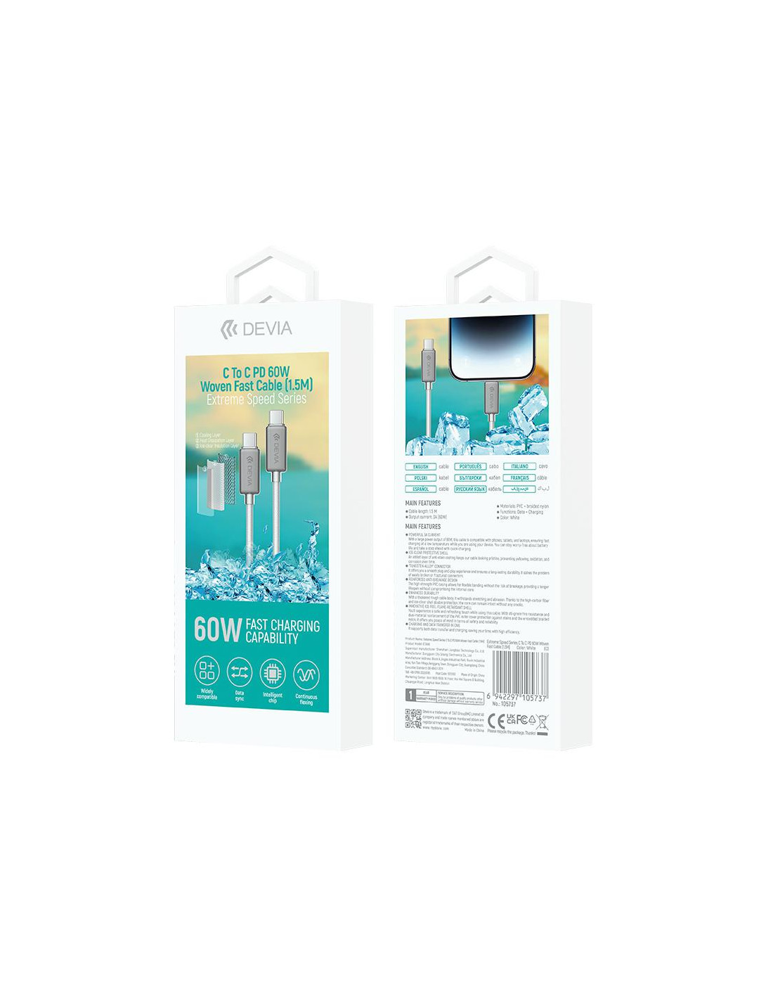 El Cable Devia Extreme PD de 60W en color blanco es la combinación perfecta entre eficiencia, seguridad y resistencia. Con conectores USB-C a USB-C, permite carga rápida Power Delivery y transferencia de datos simultánea, ideal para el uso diario con smartphones, tablets, portátiles y otros dispositivos con entrada USB-C. Su longitud de 1,5 metros ofrece el equilibrio ideal entre comodidad y portabilidad, permitiendo usar tus dispositivos mientras se cargan sin restricciones.